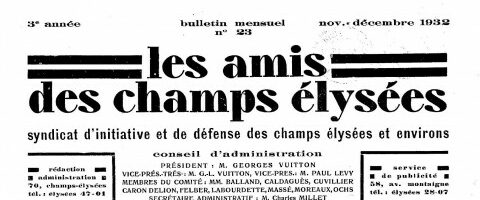 This monthly newsletter, published from 1930 to 1939, reflects the association’s goals: the beautification and development of the neighborhood. As the magazine’s masthead shows, the Vuitton family, who presumably founded it, had a definite influence, since Georges Vuitton (son of Louis Vuitton, founder of this dynasty of trunk makers) was its president and his own son, Gaston-Louis Vuitton, was both vice-president and treasurer. The Vuitton family’s interest in the Champs-Élysées is obviously linked to the construction of the brand’s headquarters by architect Louis Bigaux at 70 Avenue des Champs-Élysées in 1912 in a sober and elegant Art Nouveau style. They thus contributed to the transformation of the Champs-Élysées, which, from a bourgeois avenue, became a location for grand hotels and banks, as well as major French and international brands, from 1898 onwards.
