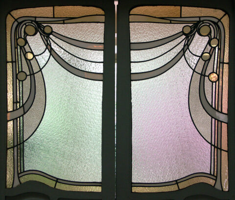Vitrail des portes coulissantes entre la hall le salon de l’hôtel Mezzara. Photo F. D.