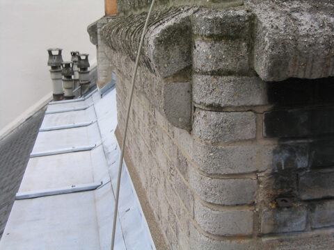 Briques silico-calcaires sur une souche de cheminée de l’hôtel Mezzara, 60 rue Jean-de-La-Fontaine, Paris XVIe. Photo Nicolas Horiot.