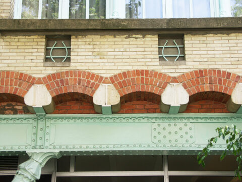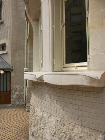 C’est aussi à partir de 1909 (hôtel Guimard, cour de l’immeuble Trémois, hôtel Mezzara) qu l’on voit apparaitre un modèle de briques à angle arrondi, en particulier au niveau des jambages des baies où elles adoucissent le passage d’un plan à l’autre.