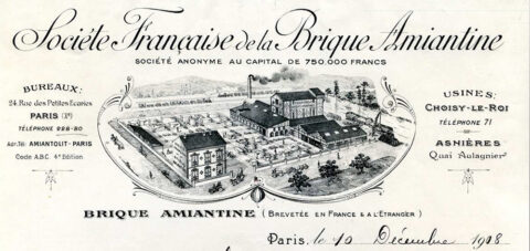 En-tête de la Société Françaises de la Brique Amiantine, lettre datée du 10 décembre 1908, photographie tirée de l’article de Pierre Coftier, « La brique amiantine de Choisy-le-Roy », L’actualité du Patrimoine, n° 8, déc. 2010. Droits réservés.