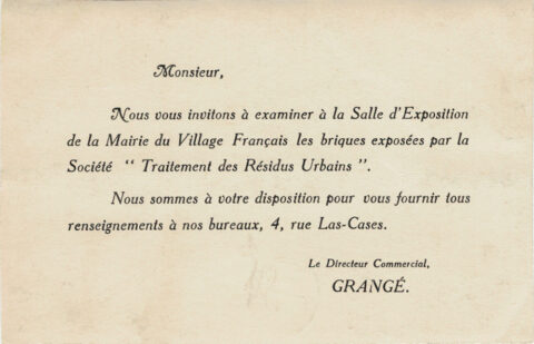 Carte émise par la Société de Traitement des Résidus Urbains invitant à visiter la salle d’exposition de la mairie du Village Français, verso. Coll. part.