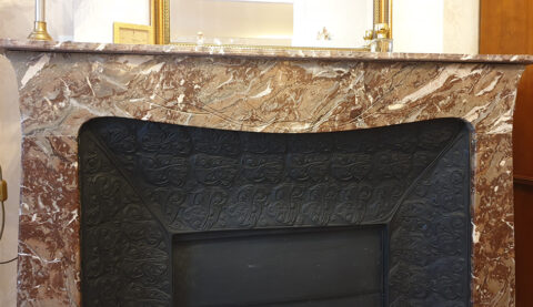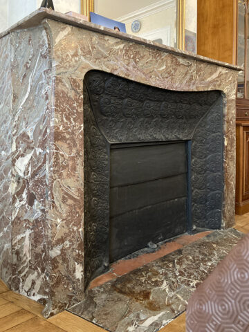 La cheminée d’Hector Guimard est entourée d’un décor de cheminée constitué d’un plaquage en marbre rouge et veiné. Le dessus de la cheminée est, lui, constitué d’une plaque de bois recouverte d’un décor peint de faux marbre.