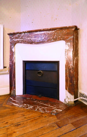 Cheminée au 2ème étage de l’hôtel Mezzara, avec un manteau en marbre semblable à celui restauré dans l’immeuble Trémois. Le rétrécissement est constitué de simples plaques en faïence plane. Photo F. D.