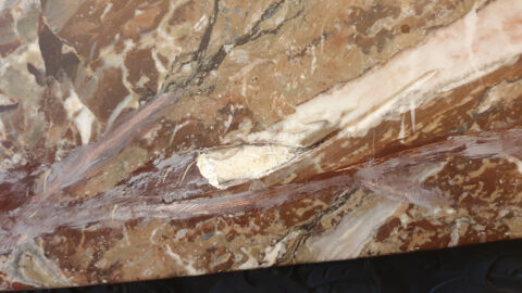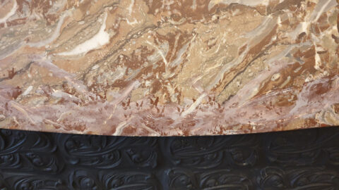 Certaines zones présentant des traces de coups d’outil ont été légèrement retouchées à l’aquarelle. L’ensemble de la surface du marbre a été recouverte d’une fine couche de cire microcristalline afin de redonner toute sa brillance au marbre.