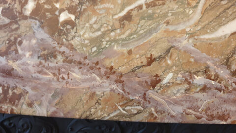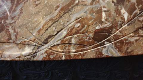Cette cheminée présentait autrefois un décor fin et ciselé dans le marbre sur le linteau supérieur. Il a été recouvert d’un enduit au plâtre et d’une retouche colorée à la peinture, probablement acrylique, cherchant à recréer les veines du marbre.