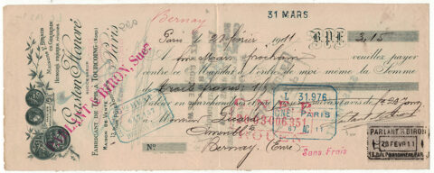Lettre de change de la société Gaston Honoré, Parlant & Biron successeurs, datée du 31 mars 1911. Coll. part.