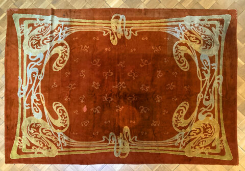 Tapis par Guimard, fabricant inconnu, larg. 4 m, long. 6 m. Vente Sotheby’s Paris 24/11/2015, laine à points noués, restauration par Rugs & Tapestries, Padoue.