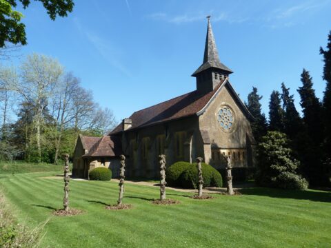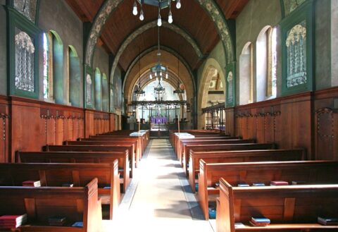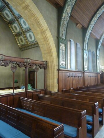Ainsi, et à quelques détails près, en passant par le lych gate pour découvrir l’église entre les arbres, on peut presque croire qu’on est devant une petite église ou chapelle traditionnelle du pays. Mais les détails en question – la colombe dorée, au sommet de la flèche, avec une branche d’olivier dans le bec ou encore les cuvettes en fonte en tête des tuyaux de descente des eaux pluviales, avec leur décor végétal très Art Nouveau – ne permettent pas de se tromper quant à l’époque de construction de l’église, et s’avèrent, en fait, être des créations non pas de l’architecte mais du décorateur.