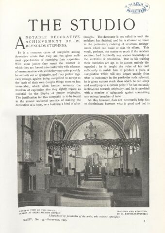 L’article félicite le décorateur et l’architecte pour le respect que chacun montre pour le rôle de l’autre. Il est généreusement illustré mais ne retient que les contributions de Reynolds-Stevens, sans aucun plan de l’église ni image de son extérieur.