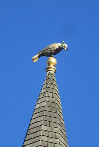 Colombe dorée au sommet de la flèche de l’église, dessinée par William Reynolds-Stevens. Photo Paul Smith.