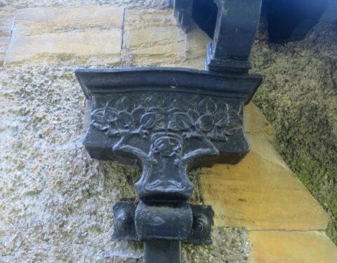 Cuvette en fonte en tête des tuyaux de descente des eaux pluviales, dessinée par William Reynolds-Stevens. Photo Paul Smith