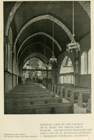 La décoration de l’église est conçue et exécutée par le peintre-sculpteur-décorateur William Reynolds-Stevens (1862-1943), artiste très polyvalent mais moins connu que l’architecte. L’intérieur de Saint Mary représente son seul ensemble décoratif conservé intact. Il est né, de parents britanniques, à Detroit, Michigan, en 1862 mais revient en Angleterre où il est formé d’abord comme ingénieur, avant de se tourner vers les beaux-arts et de suivre des cours, de 1885 à 1887, aux Royal Academy Schools. Mais sa formation initiale aide peut-être à expliquer les compétences dont il fait preuve dans le travail de matériaux très variés et surtout des métaux. Membre comme Townsend du Art Workers’ Guild, il y fait des conférences en 1890 sur « le décapage, coloriage et laquage des métaux » et, en 1910, sur « la fonte du bronze »[19]. Ses tableaux connus, comme Interlude, publié dans The Studio en 1899[20], sont post-préraphaélites, assez proches des compositions-péplum de Lawrence Alma-Tadema (1836-1912), pour qui il a travaillé[21]. Mais, à partir de 1894, Reynolds-Stevens renonce à la peinture pour se consacrer à la sculpture et à la décoration.