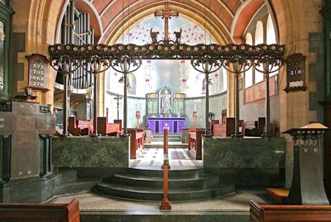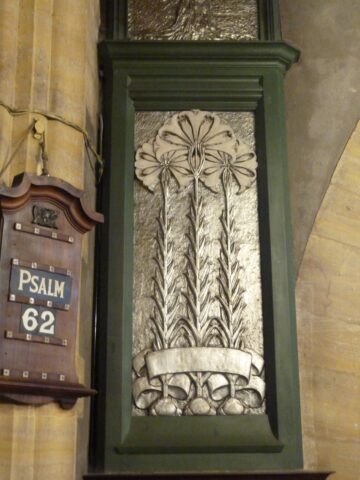 Il y a également une certaine confusion quant à la nature de l’aluminium appliqué aux surfaces en relief. Dans leur cadre de bois peint en vert, les panneaux des lis, qui portent la signature « W R-S 1903 », auraient été préfabriqués, en quelque sorte, dans le studio londonien du sculpteur, où, à cette époque, il est secondé par deux assistants et un apprenti[32]. Mais est-ce que la métallisation y est effectuée par l’application d’une poudre d’aluminium dissoute dans un solvant, c’est-à-dire une peinture d’aluminium, ou en feuilles très minces, par ce qu’on appelle parfois la dorure à l’aluminium ? Les deux techniques sont attestées[33], et peuvent même être associées. Le traitement de l’abside paraît plus clairement consister en feuilles d’aluminium. Noirci par la suie des cierges, ce plafond a été restauré en 1980 par Harold Lansdell.
