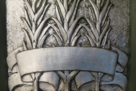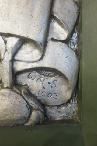 Le mouvement Art & Crafts, dans son rejet des produits industriels, accepte le fer forgé mais répudie la fonte et à l’acier, sortis d’usine. Quant à l’aluminium, il est difficile à imaginer des procédés de fabrication moins artisanaux que la production Hall-Héroult par électrolyse, mise en œuvre au Royaume-Uni, par la British Aluminium Company, dès 1896[29]. Mais Reynolds-Stevens ne semble pas avoir eu de préjugés à l’égard des origines industrielles des matériaux qu’il utilise. La fonte lui sert, comme on l’a vu, pour les cuvettes en haut des tuyaux de descente qui ornent les murs extérieurs de l’église au nord et au sud. Quant à l’aluminium, devenu alors, depuis une dizaine d’années seulement, un matériau relativement accessible, moins cher dorénavant que l’or ou l’argent, Reynolds-Stevens s’en sert déjà dans sa décoration du salon du 185 Queen’s Gate à Londres, que Heseltine visite en 1901. Au-dessus des tableaux, une frise en plâtre modelée en vignes et arbres fruitiers souligne le plafond qui est couvert en feuilles d’aluminium[30].