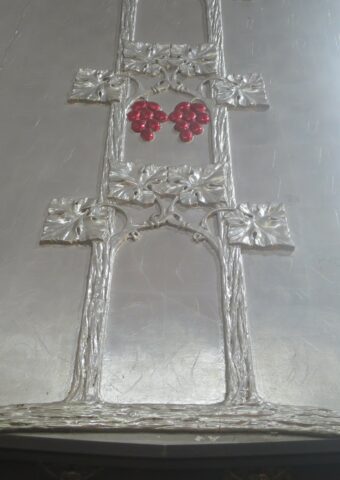 Le plafond de l’abside, derrière le Christ, déploie également un décor en bas-relief de vignes géométriquement stylisées et des grappes de raisins peintes en rouge vif.
