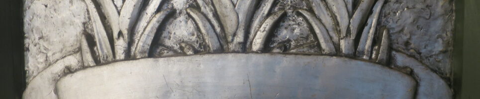 Le mouvement Art & Crafts, dans son rejet des produits industriels, accepte le fer forgé mais répudie la fonte et à l’acier, sortis d’usine. Quant à l’aluminium, il est difficile à imaginer des procédés de fabrication moins artisanaux que la production Hall-Héroult par électrolyse, mise en œuvre au Royaume-Uni, par la British Aluminium Company, dès 1896[29]. Mais Reynolds-Stevens ne semble pas avoir eu de préjugés à l’égard des origines industrielles des matériaux qu’il utilise. La fonte lui sert, comme on l’a vu, pour les cuvettes en haut des tuyaux de descente qui ornent les murs extérieurs de l’église au nord et au sud. Quant à l’aluminium, devenu alors, depuis une dizaine d’années seulement, un matériau relativement accessible, moins cher dorénavant que l’or ou l’argent, Reynolds-Stevens s’en sert déjà dans sa décoration du salon du 185 Queen’s Gate à Londres, que Heseltine visite en 1901. Au-dessus des tableaux, une frise en plâtre modelée en vignes et arbres fruitiers souligne le plafond qui est couvert en feuilles d’aluminium[30].