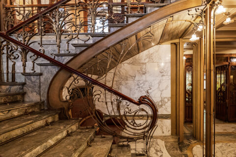 Victor Horta, hôtel Solvay, 224 avenue Louise à Bruxelles, 1895-1902, départ de la rampe d’escalier au rez-de-chaussée. Photo Gilles van den Abeele.