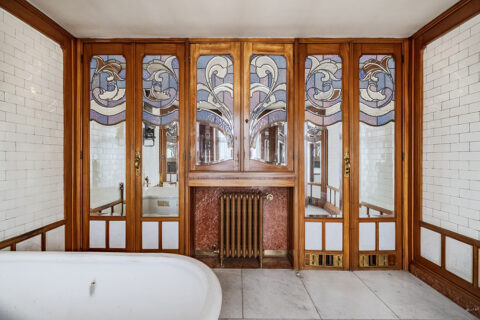 Entre le premier et le deuxième étage, Horta a placé la salle de bains en entresol. Il y mélange avec audace les matériaux industriels comme la brique émaillée blanche avec le marbre de Carrare sertis dans des boiseries de frêne d’Amérique posées sur une plinthe de marbre rouge. A l’opposé de la fenêtre, les panneaux des portes et placards sont revêtus de miroirs biseautés et de verres américains utilisés ici pour leur texture et leurs couleurs et non pour laisser passer la lumière, sauf dans la porte qui donne sur le corridor d’accès. Les six panneaux composent un splendide motif ornemental. Cette salle de bains témoigne d’un grand raffinement sans être ostentatoire. On n’est pas à l’hôtel de la Païva.